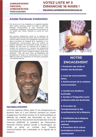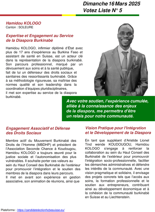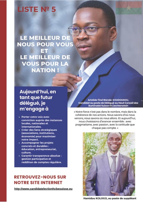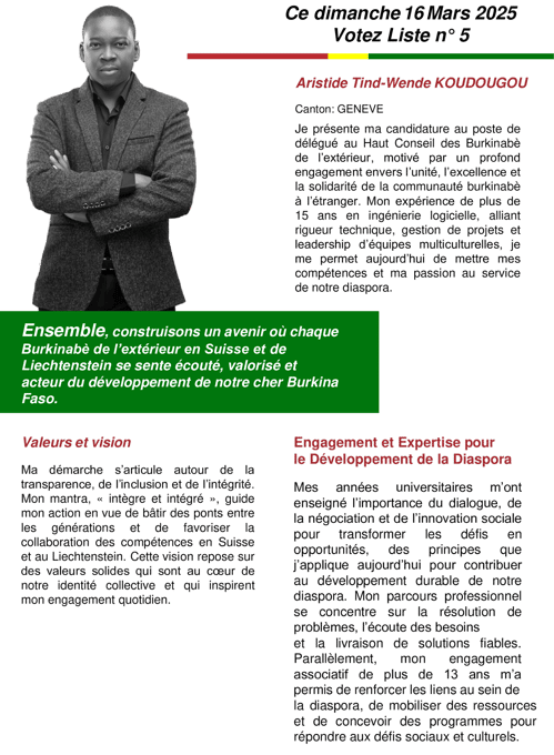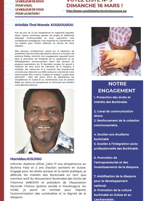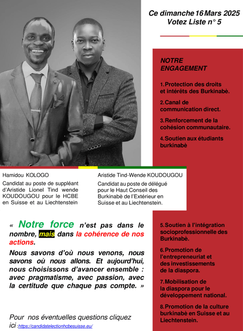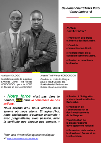 Ensemble, construisons un avenir où chaque Burkinabè de l’extérieur en Suisse et au Liechtenstein se sente écouté, valorisé et acteur du développement de notre cher Burkina Faso.